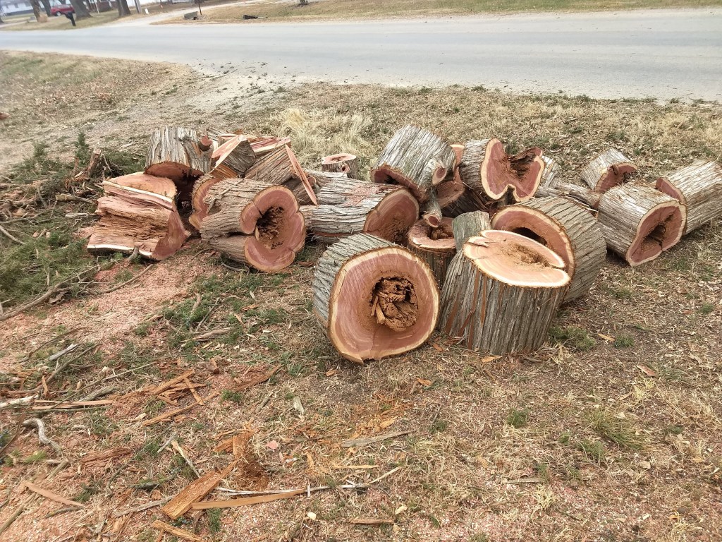 Then December came and I was able to to see my boys for the holidays I was so concentrated on driving I didn’t take a whole lot of pictures. All in all I did over 3,000 miles on this trip. I was able to stop at my place in New Mexico for about 3 days and then on to Texas for Christmas. Then it was a drive into Kansas to be with the other son. He had the job of cutting down three of his cedar trees. One of the trees about blew over during the wind storm. I helped load branches and wood cuttings into a trailer so they could move them to the dump site. It was quite a chore. I had a great visit with him during that time. My last day there it’s snowed about 3 inches but by the next morning most of it was gone. And I was on my way back to the farm.